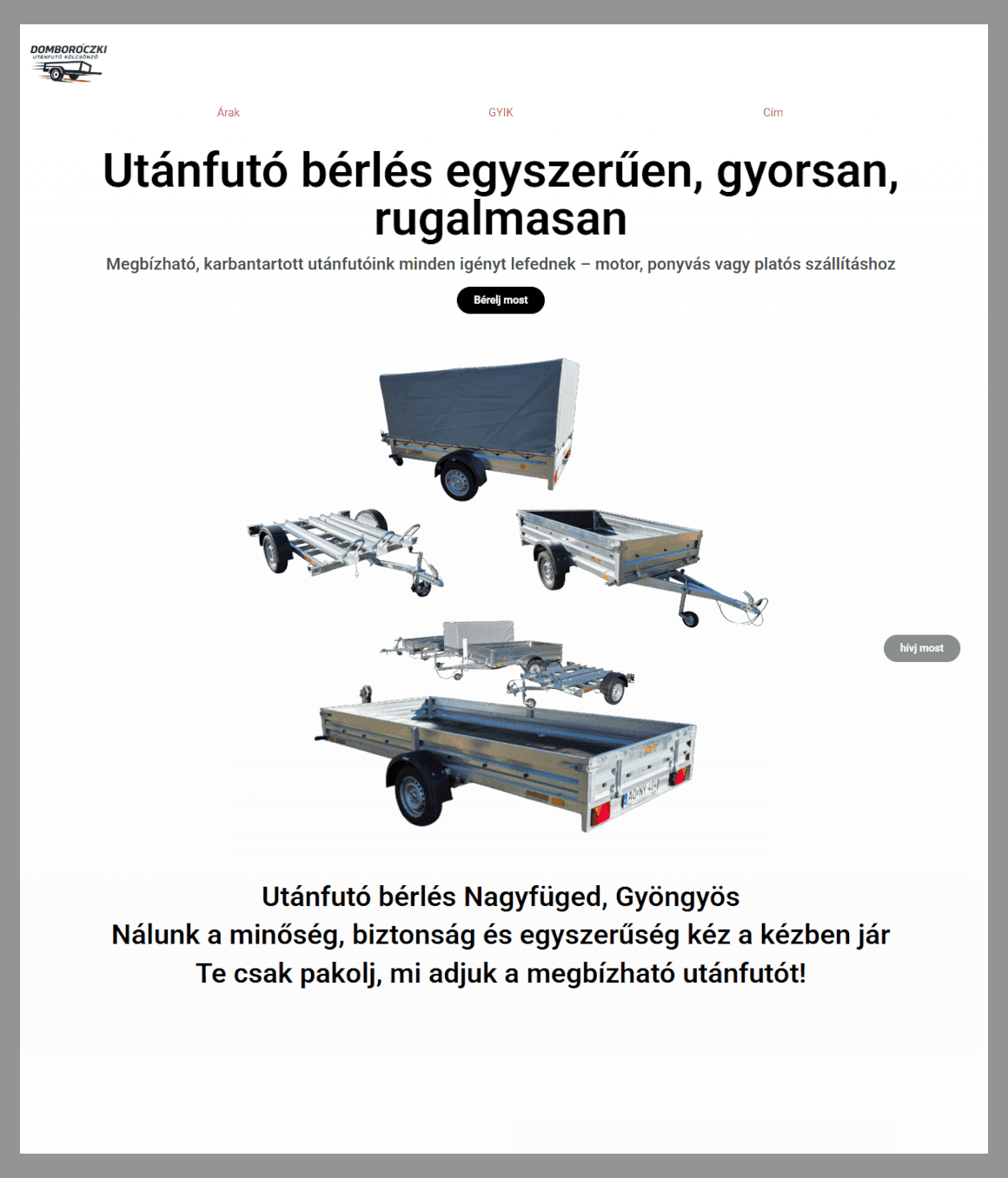 Kész az új weboldalam, ami az utanfutók bérlèsével kapcsolatos. Ha valaki szeretne weboldalt , akkor ajánlom figyelmetekbe Gergő Herkó -t. Nagyon klassz, gyors és precíz, valóban látszik rajta, hogy élvezettel készít minden oldalt. Köszönöm ezúton is
